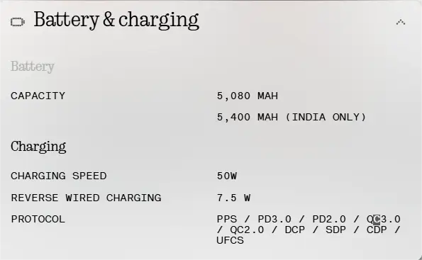• Capacity: Around 5,080–5,400 mAh depending on the variant.